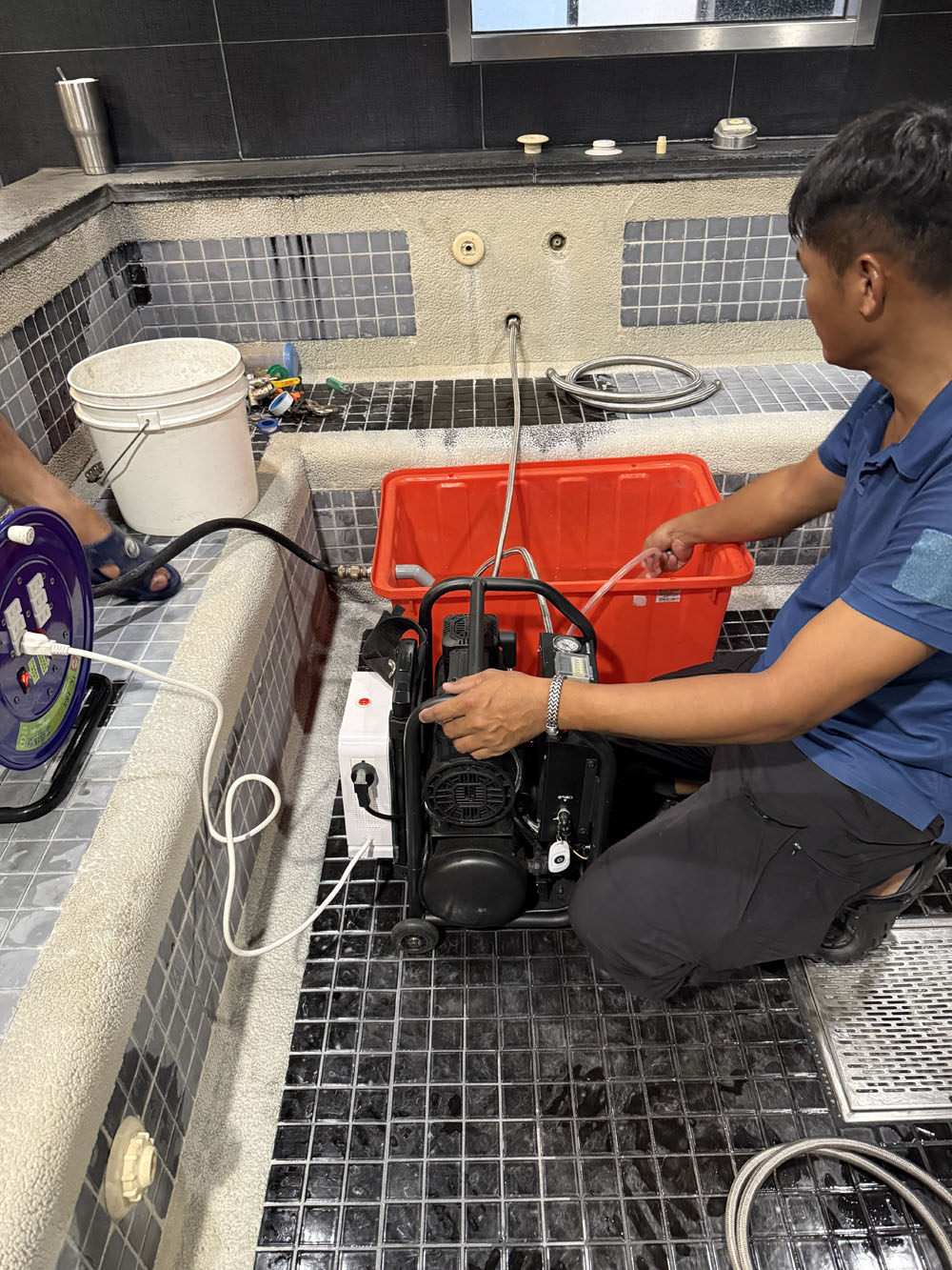 本案針對商用SPA池冷熱水循環管線進行高周波清洗疏通,利用設備震動方式分解管內水垢與沉積物,改善水量不足與溫度不穩定問題,全程不破壞原有管線,適合高使用頻率的營業場所。